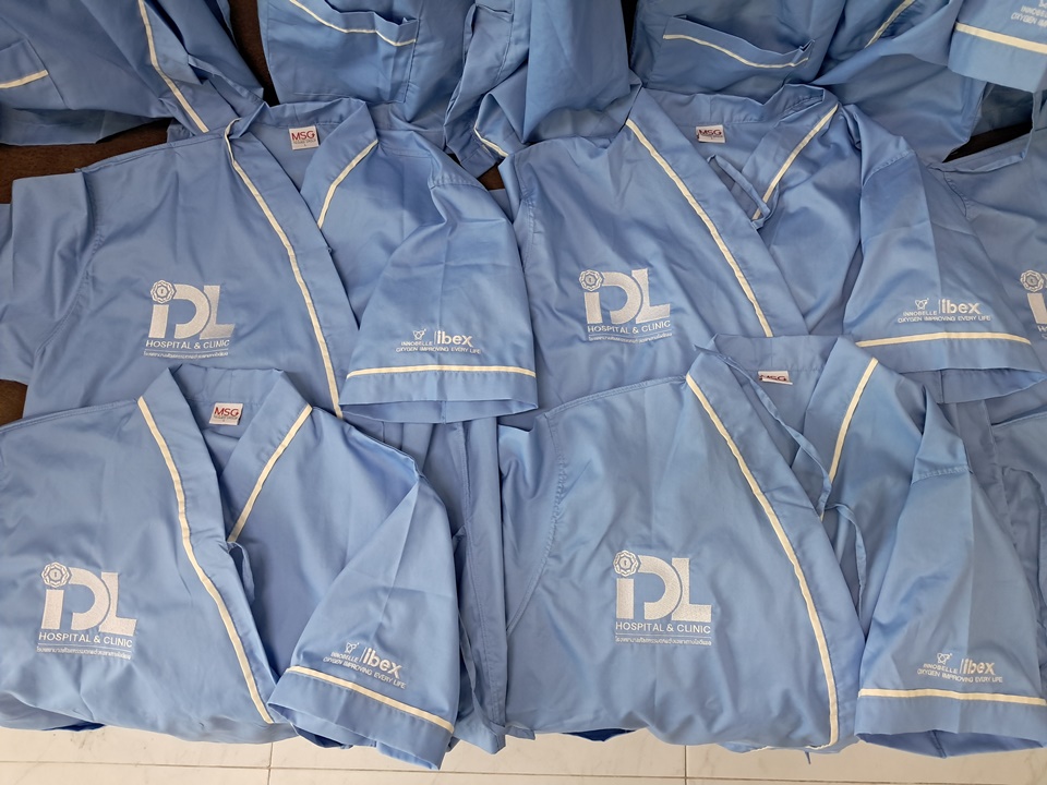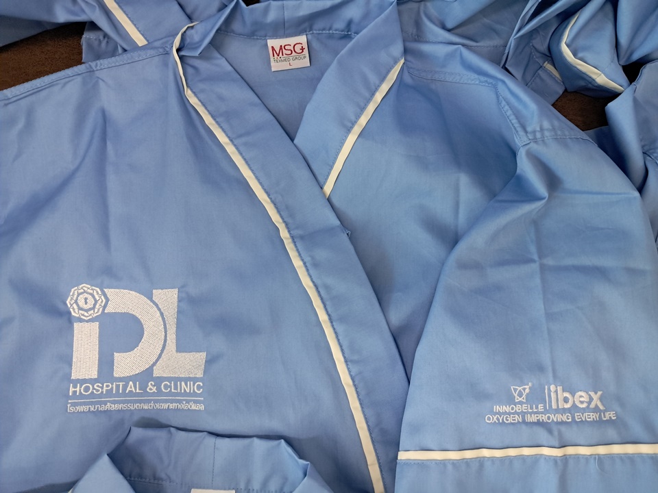 งานปักเสื้อคลุมผู้ป่วยจำนวนมาก สองตำแหน่ง ปักชุดคลุมคลินิคความงาม ปักโลโก้ รพ.ศัลยกรรมตกแต่ง ที่อก และโลโก้สินค้าที่บริเวณแขน สนใจปักเสื้อคลุม ปักชุดคลุมคนไข้ ติดต่อได้เลยจ้า Line: @motherpin