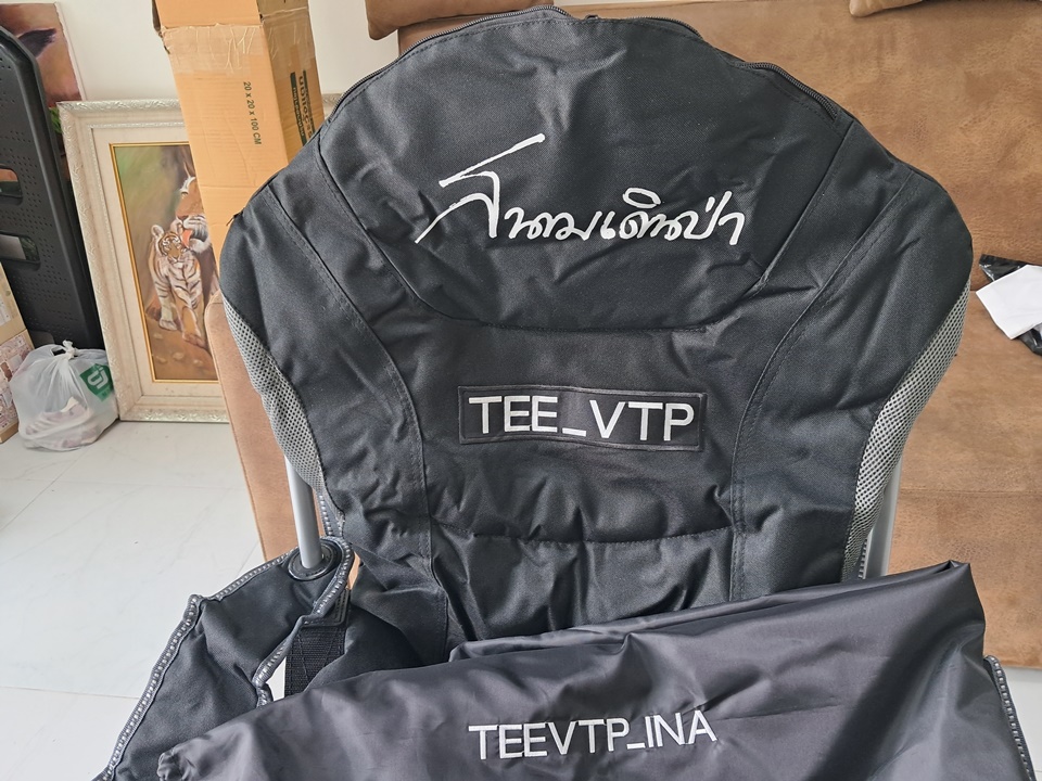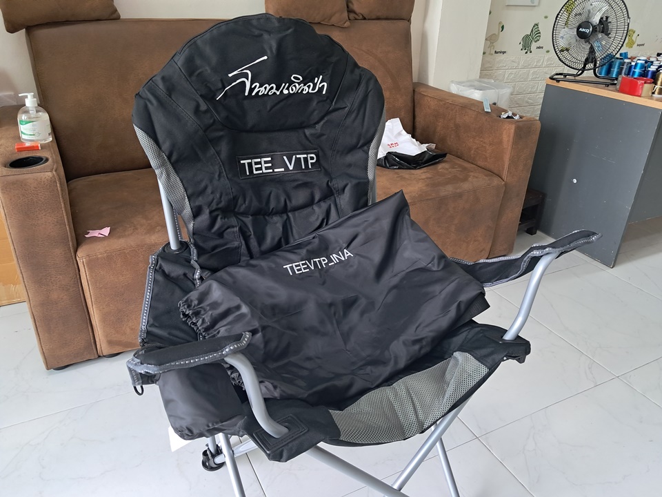 งานปักเก้าอี้สนาม ยี่ห้อสนามเดินป่า ปักชื่อศิลปิน นักแสดง ไว้สำหรับนั่งในกองถ่าย หรือจะออกแคมป์ปิ้งก็ได้นะจ้ะ