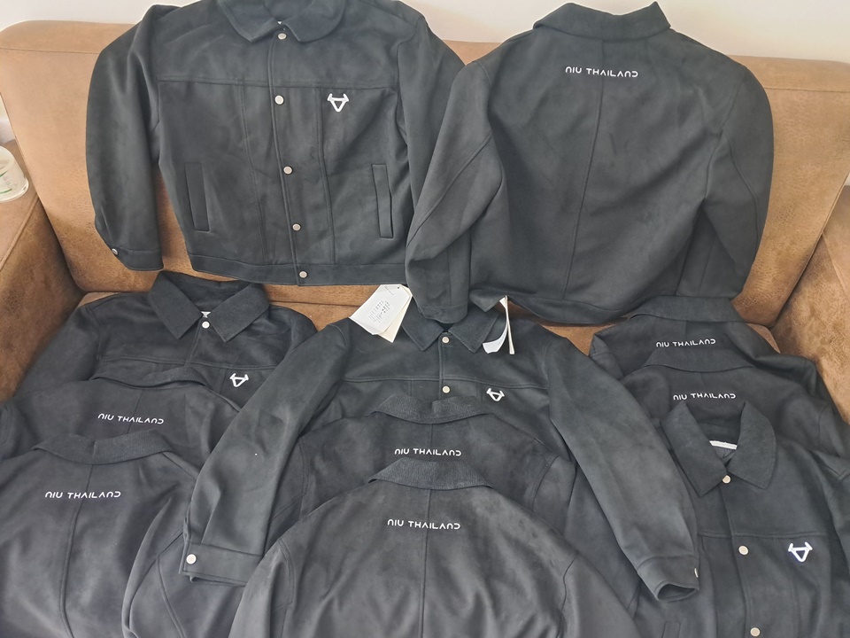 งานปักแจ็คเก็ตหนังเทียม PU จำนวนมาก 2ตำแหน่ง อกและหลังคอ ปักโลโก้บริษัทมอร์เตอร์ไซค์ไฟฟ้าเจ้าดัง